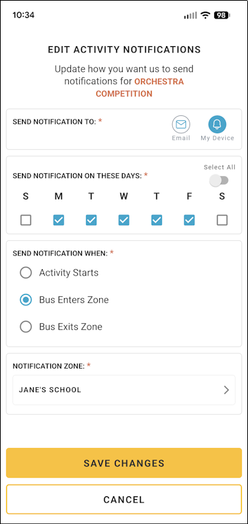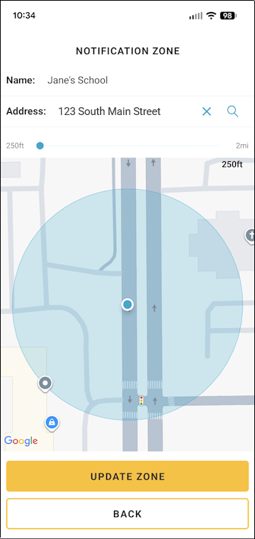 Note: Your choices are when the activity begins, when the bus enters the activity zone, or when the bus exits the zone. The notification zone is a circular area surrounding where the bus will be dropping off/picking up your child for the activity. For example, if the bus is returning your student to their school after a field trip, you might have the school address entered for the zone. In that case, you would have Bus Enters Zone selected, which would send you an alert when the bus enters the circle you've designated. - If you want to change to a different activity zone or modify the current one, follow these steps: