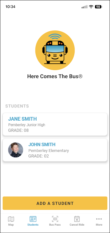 In the new Here Comes the Bus (HCTB) app, you can add a photo of your student from your device on the Students page, as follows: